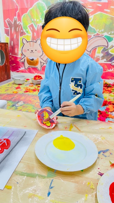 또, 나뭇잎에 물감을 묻혀 톡톡 도장 찍기를 하며