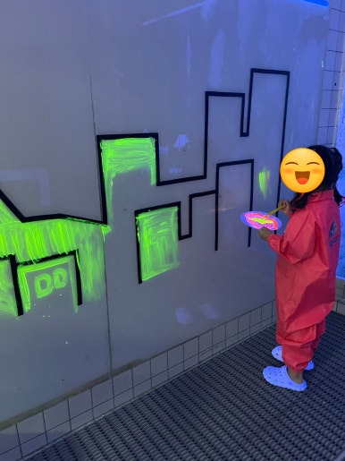 블랙라이트를 켜 야광 물감을 비추어 보았어요.